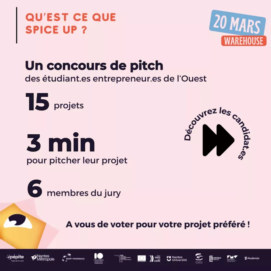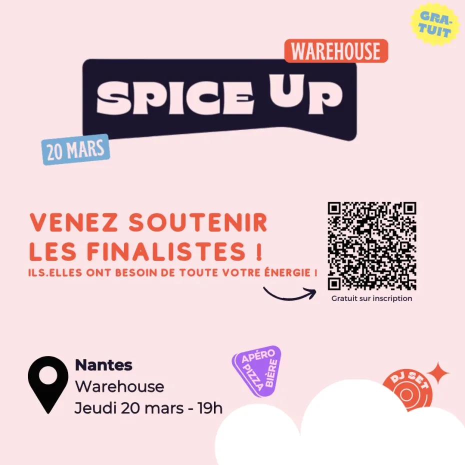 L’entrepreneuriat étudiant nantais est en ébullition ! Le jeudi 20 mars, au Warehouse, les 15 meilleurs projets étudiants s’affronteront lors de la finale du concours de pitch Spice Up 2025. Plus qu’un concours, c’est une soirée pleine d’énergie, d’inspiration et de rencontres pour tous les passionné.e.s d’entrepreneuriat. 🚀